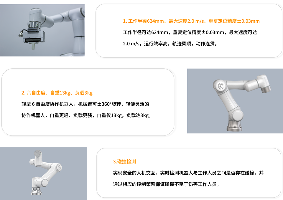 BFT机器人一站式机器人工业互联网平台提供的艾利特EC63协作机器人自重仅13kg,负载达3kg ,支持拖拽示教,能够直接和人类一起并肩工作而无需使用安全围栏进行隔离,具有高度的可靠性和安全性。