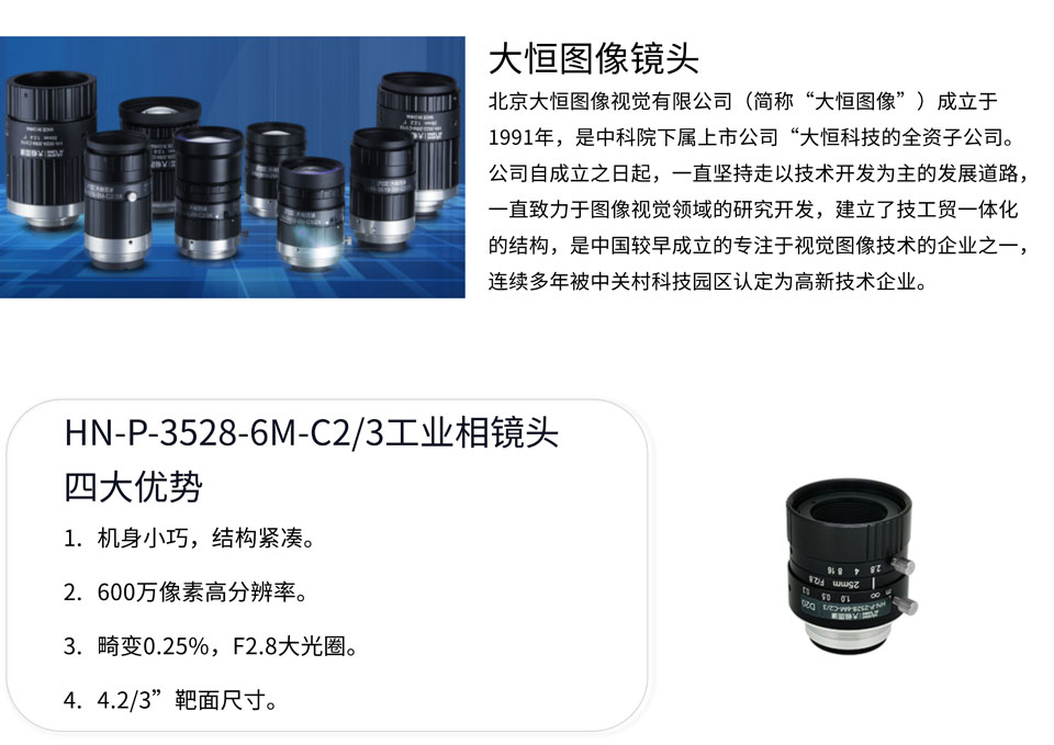 大恒图像HN-P-3528-6M-C2/3是一款焦距为35mm,靶面尺寸为2/3,适用于市场上绝大多数的工业相机的600万像素工业镜头。