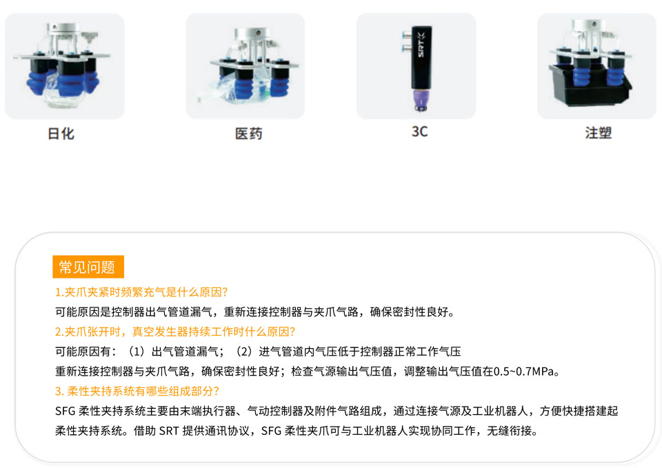 SFG-FNC3-N2020夹爪负载可达870g,最大工作压力100kPa,可以轻松夹取各类异形,易损物品。