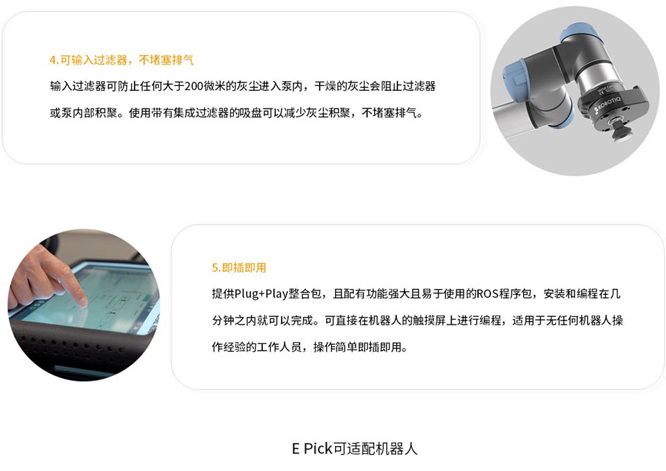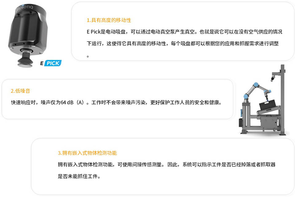EPick有一个内置的电动真空泵,可直接连接到协作机器人手腕。EPick易于安装和编程,只需将联轴器安装在机器人手臂上,然后将真空夹爪安装在联轴器上,再将联轴器的电缆连接到机器人手腕的连接器中。