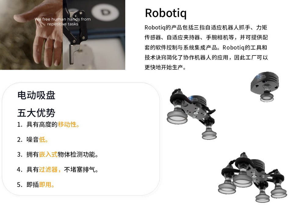 使用Robotiq真空机械爪,不需要具备机器人的知识或使用经验等背景。使用即插即用的组件和简单明了的抓取编程软件,在几分钟内便可完成安装,把程序直接接入到机器人的接触屏幕里。