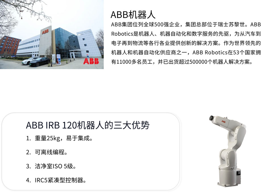 IRB 120 具有 580 mm 的水平范围、同类最佳的冲程、低于其底座 112 mm 的能力以及非常紧凑的转弯半径。是电子、食品和饮料、机械、太阳能、制药、医疗和研究等广泛行业的理想选择。