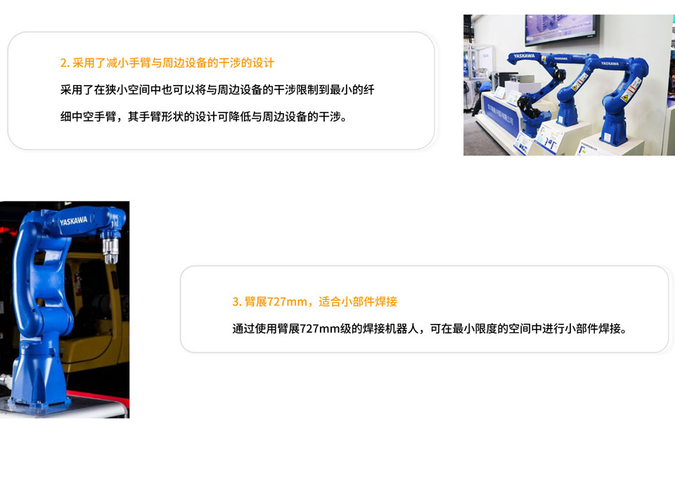 AR700可搬重量为8KG,可搭载各种伺服焊枪、传感器,通过高速动作减少节拍。采用了减小手臂与周边设备的干涉的设计,适合小部件焊接。