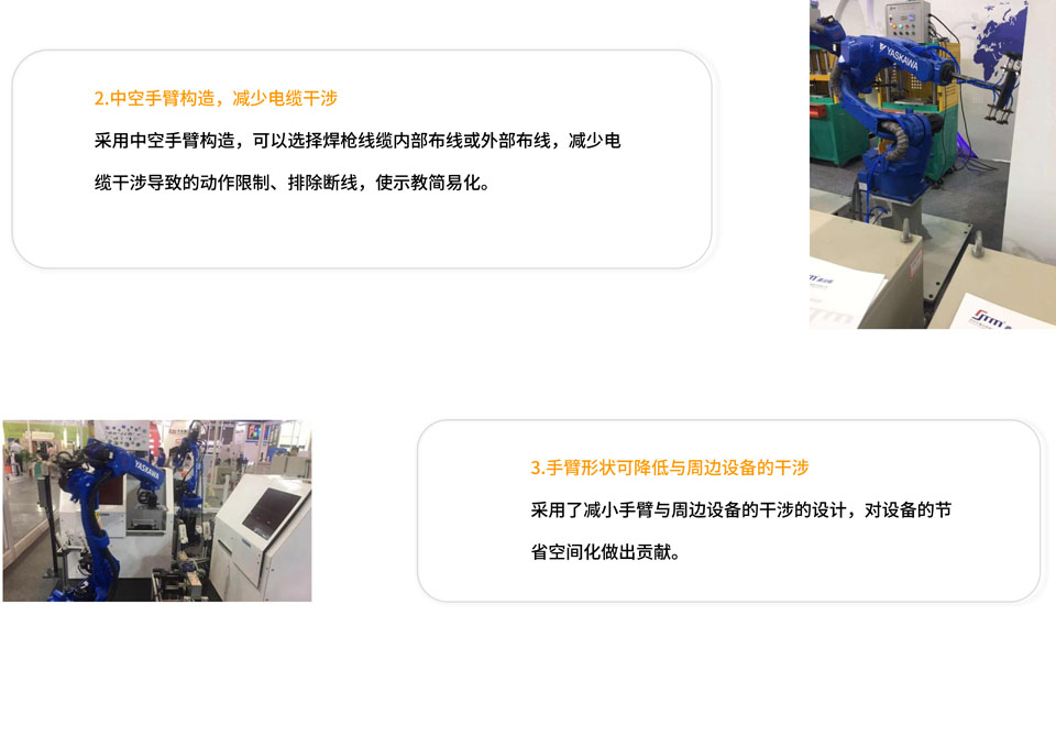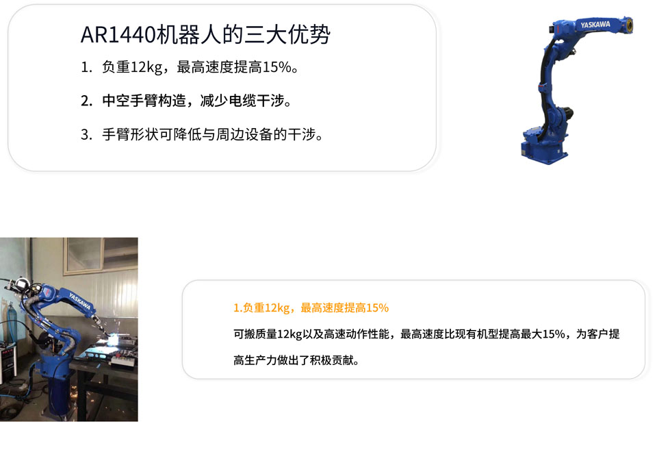AR1440可搬重量为12KG,采用中空手臂构造,可以选择焊枪线缆内部布线或外部布线 ,可以根据工作和设备进行适合的装备,采用了减小手臂与周边设备的干涉的设计。对设备的节省空间化做出贡献。