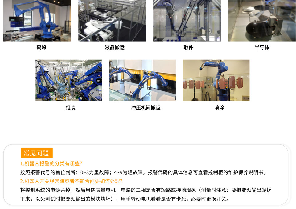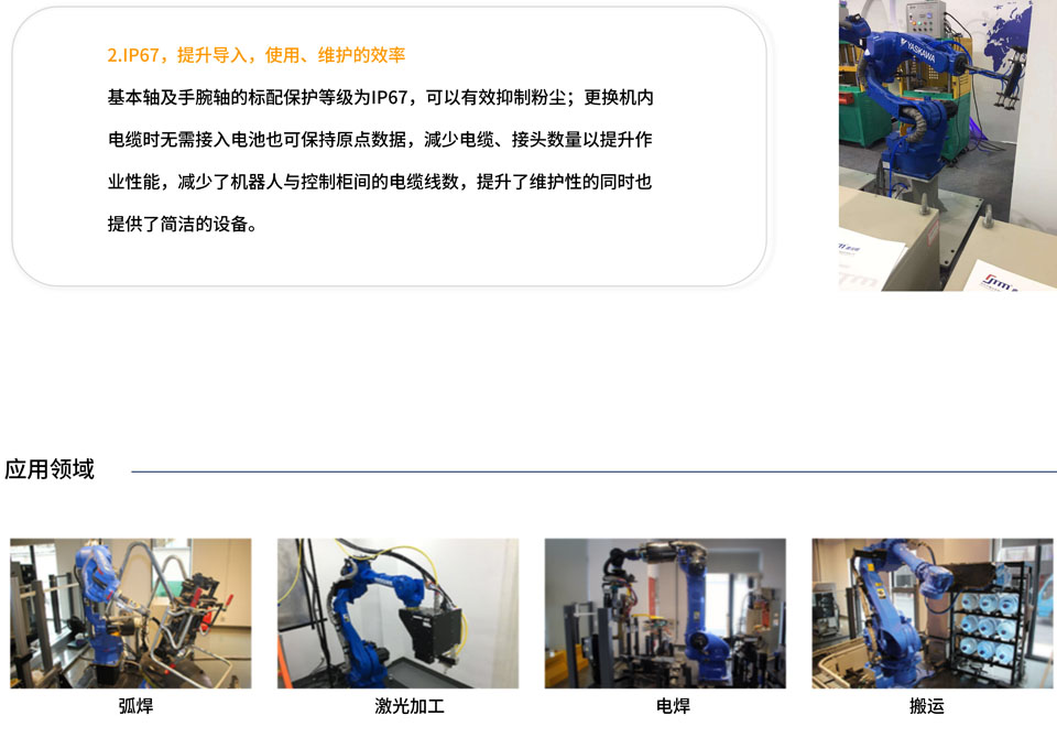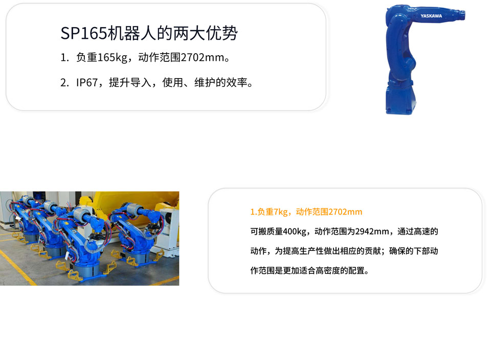 SP165可负重165kg,在确保的下部动作范围,适合高密度配置,减少了机器人与控制柜间的电缆线数,提升了维护性的同时提供简洁的设备。