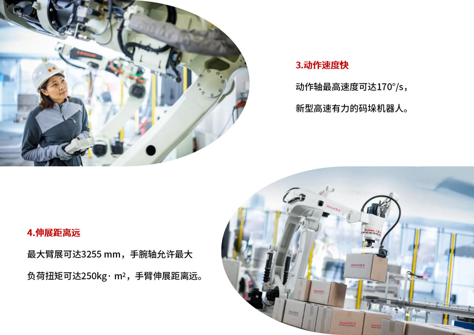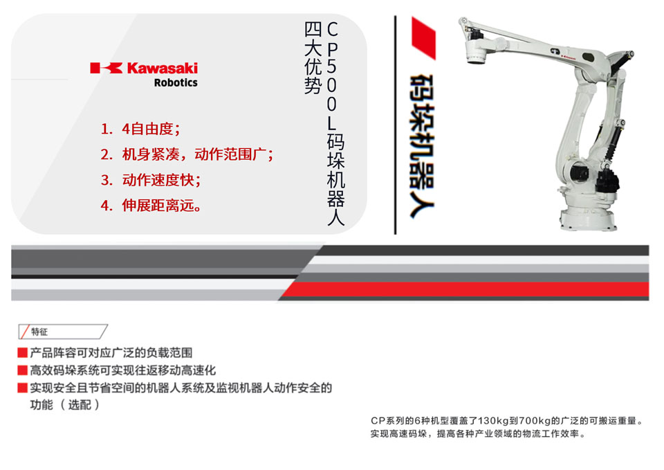 新型高速有力的码垛机器人 拥有杰出搬运水平的高速码垛机器人。 可对应食品、药品、印刷品等各行业的多种类少量化的生产需求。 同系列中重量最轻,最适用于提高码垛效率。