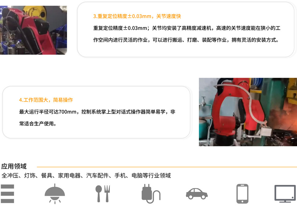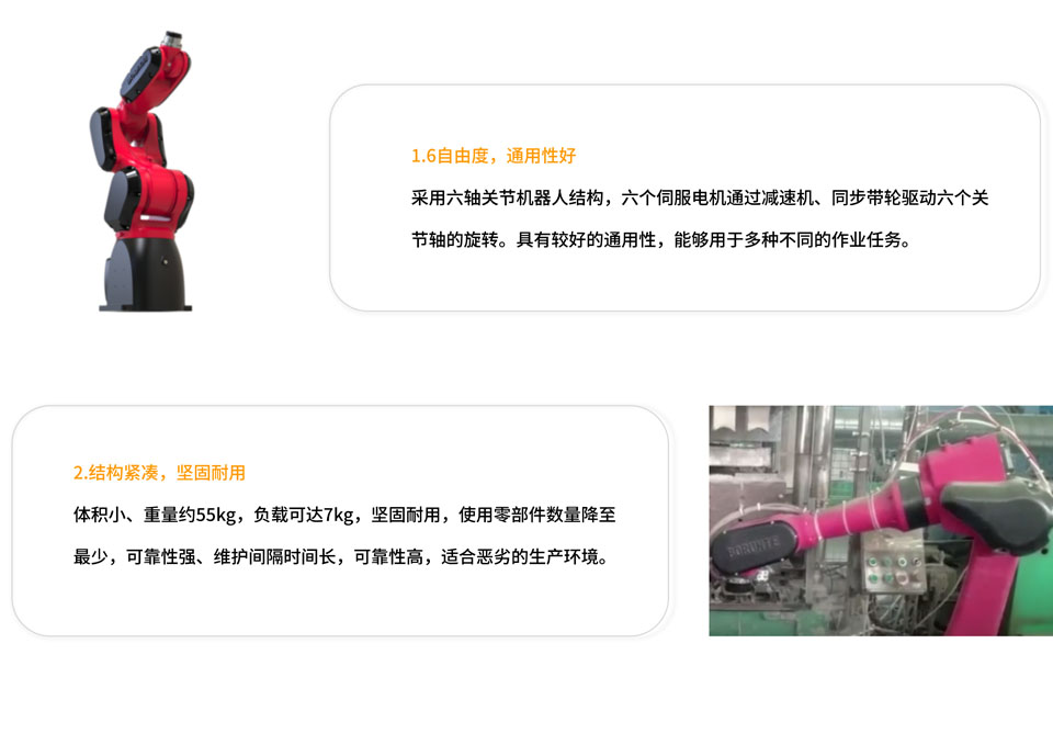 BRTIRUS0707A是伯朗特机器人股份有限公司针对某些单调、频繁和重复的长时间作业,或是危险、恶劣环境下的作业等而开发的一款六轴工业机器人,其拥有700mm臂展,最大负载可达7kg。具有多自由度的灵活性,对打磨、装配、喷涂等场景能够应对自如。 防护等级高一IP65, 防尘防水精度高一重复定位精度±0.03mm。