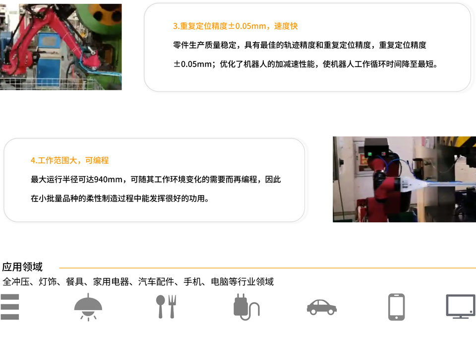 BRTIRUS0805A型机器人是伯朗特机器人第三代,整个系统操作简单、结构紧凑、定位精度高、动态性能好,其5kg的负载能力尤其适用于注塑、取件、冲压、搬运、上下料、装配等领域。 适用于注塑30T-250T。 防护等级高IP54,防尘防水。 精度高一重复定位精度±0.05mm。