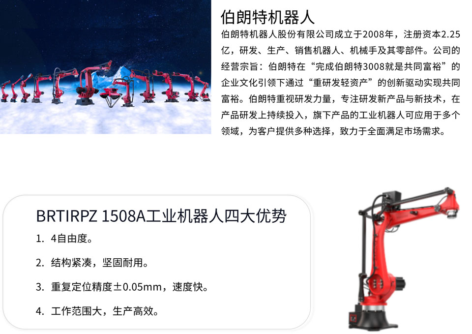 BRTIRPZ1508A最大负载为8KG,最大臂展可达1500mm。以紧凑的结构实现大范围动作,运动灵活,精准。 用途:在工业生产中能代替人做某些单调、频繁和重复的长时间作业,或是危险、恶劣环境下的作业。
