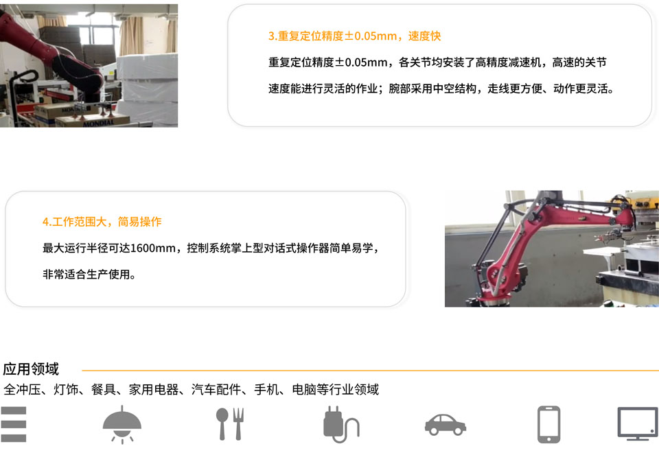 BRTIRWD1506A是针对焊接应用行业开发的六轴机器人。机器人结构紧凑、体积小、重量轻、最大负载6KG、臂展1600mm。腕部采用中空结构,走线更方便、动作更灵活。 防护等级高一手腕 IP54、本体 IP50,防尘防水精度高一重复定位精度±0.05mm。