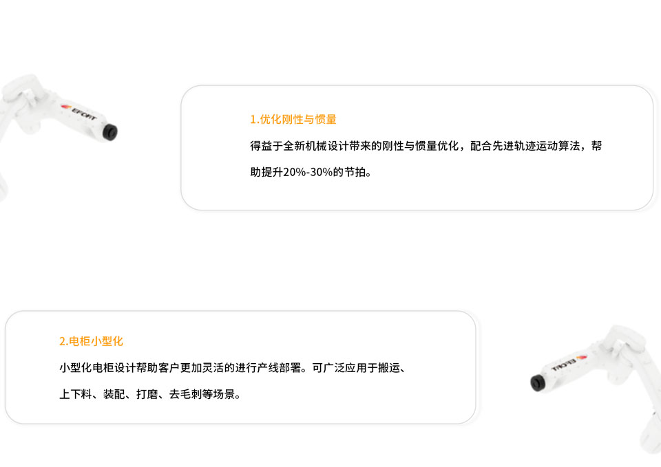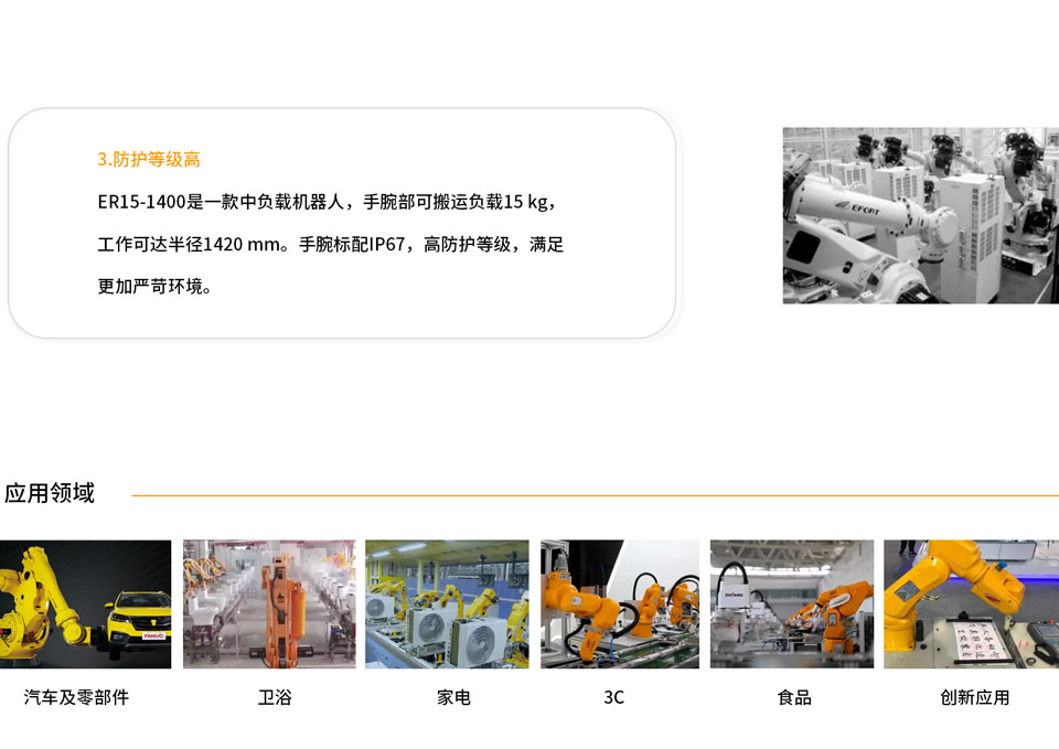ER15-1400是一款中负载机器人, 手腕部可搬运负载15 kg,工作可达半径1420 mm,得益于全新机械设计带来的刚性与惯量优化,配合先进轨迹运动算法,帮助提升20%-30%的节拍;小型化电柜设计帮助客户更加灵活的进行产线部署;手腕标配IP67,高防护等级,满足更加严苛环境。适用场景可广泛应用于搬运、上下料、装配、打磨、去毛刺等场景。适用行业 适用于PCB、金属部件、光伏等行业。