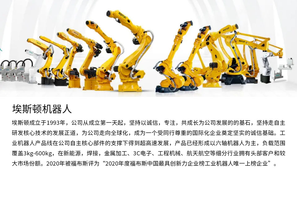 埃斯顿中负载系列产品广泛应用于光伏排版,锂电堆叠,PCB板上下料,汽车零部件搬运、压铸取件/喷涂及打磨等领域。此系列机型具有维护便捷、精度高、节拍快造型美观等特点。并支持Estun Editor PC编程软件,调试更便捷。