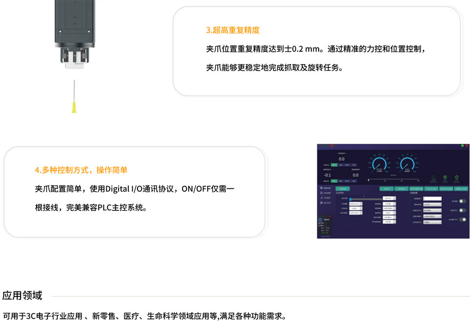 Z-EFG-20C夹爪是一款高性价比的驾照,无滑环,维护成本低,支持无限旋转和相对旋转,支持Modbus 总线控制和I/O控制。