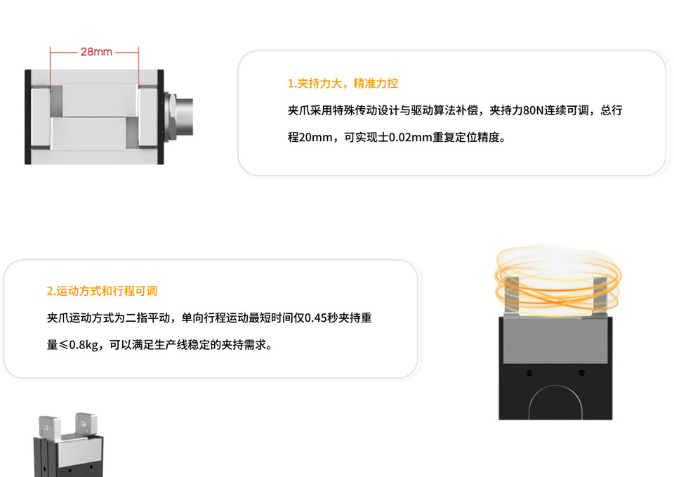 Z-ERG-20电动夹爪支持无限旋转和相对旋转,无滑环,维护成本低,旋转和夹持力、位、速度可以精准控制,支持Modbus 总线控制和I/O控制。