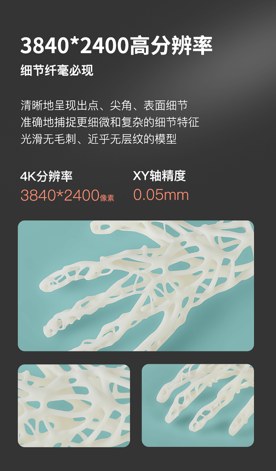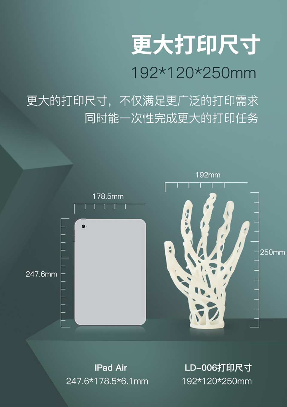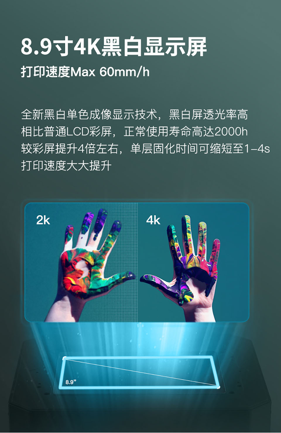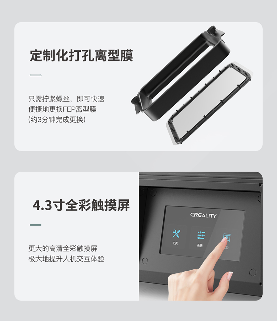 LD-006光固化3D打印机,拥有8.9寸4K黑白显示屏,打印速度60mm/h,3840*2400高分辨率,192*120*250mm打印尺寸,内置空气净化系统,人性化创新料槽,喷砂成型平台。