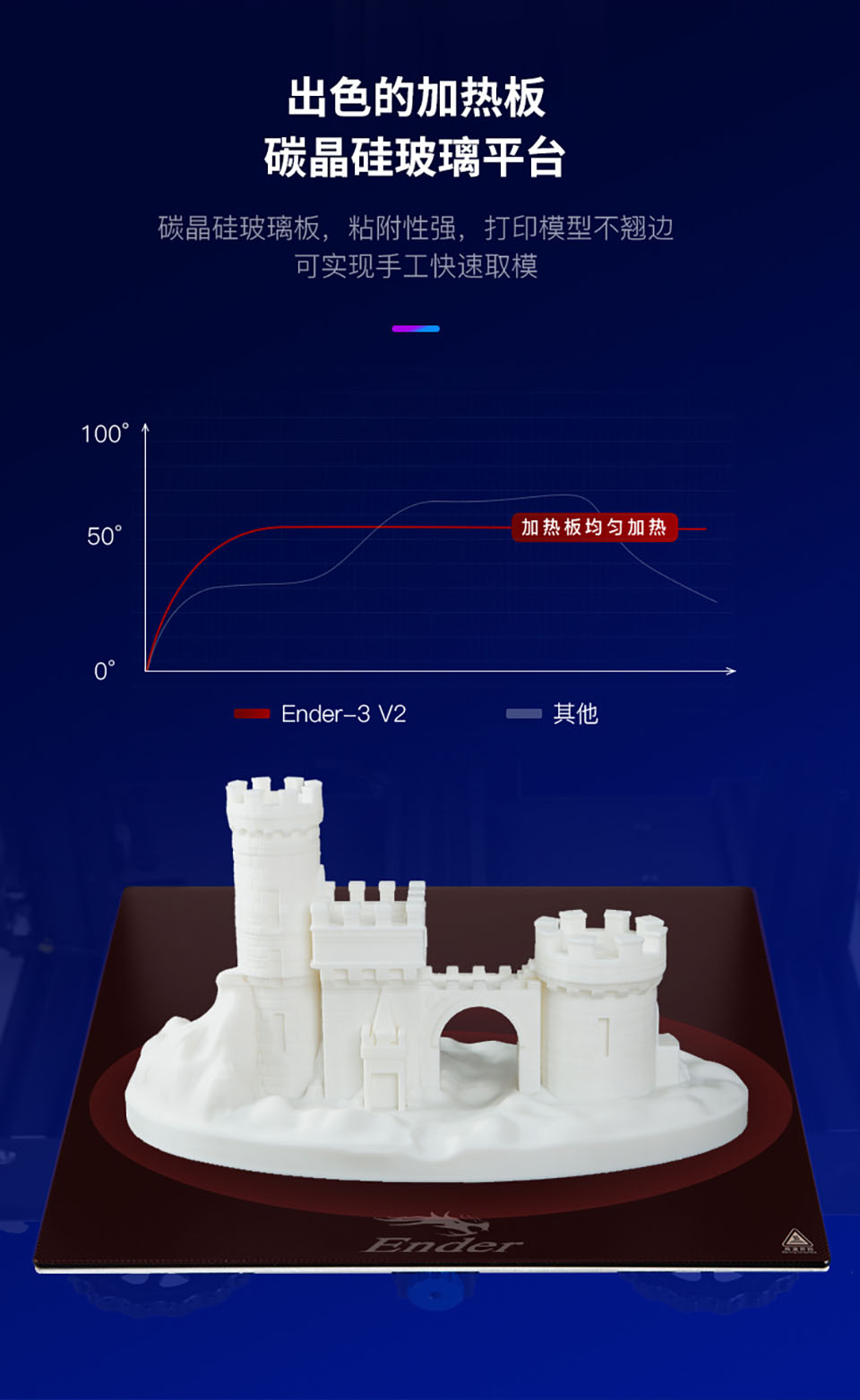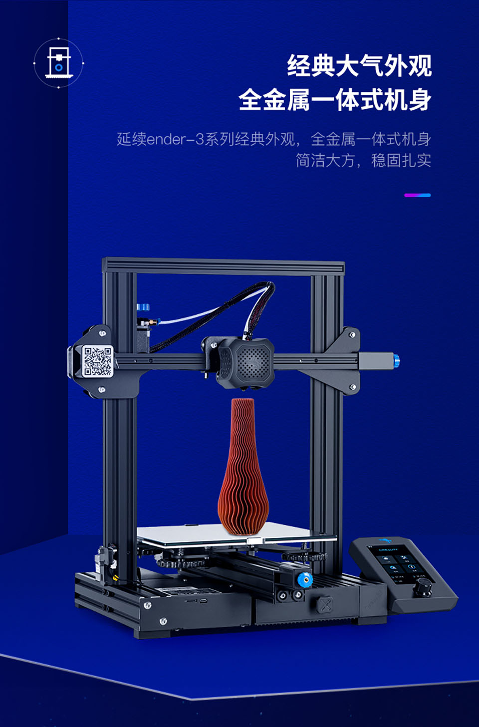 Ender-3 V2品质媲美工业级,经典稳固外观,一体式结构设计,高精易用,支持断电续打,人性化设计,全新UI界面,尺寸适中,价格实惠,适合个人家用、创客教育。