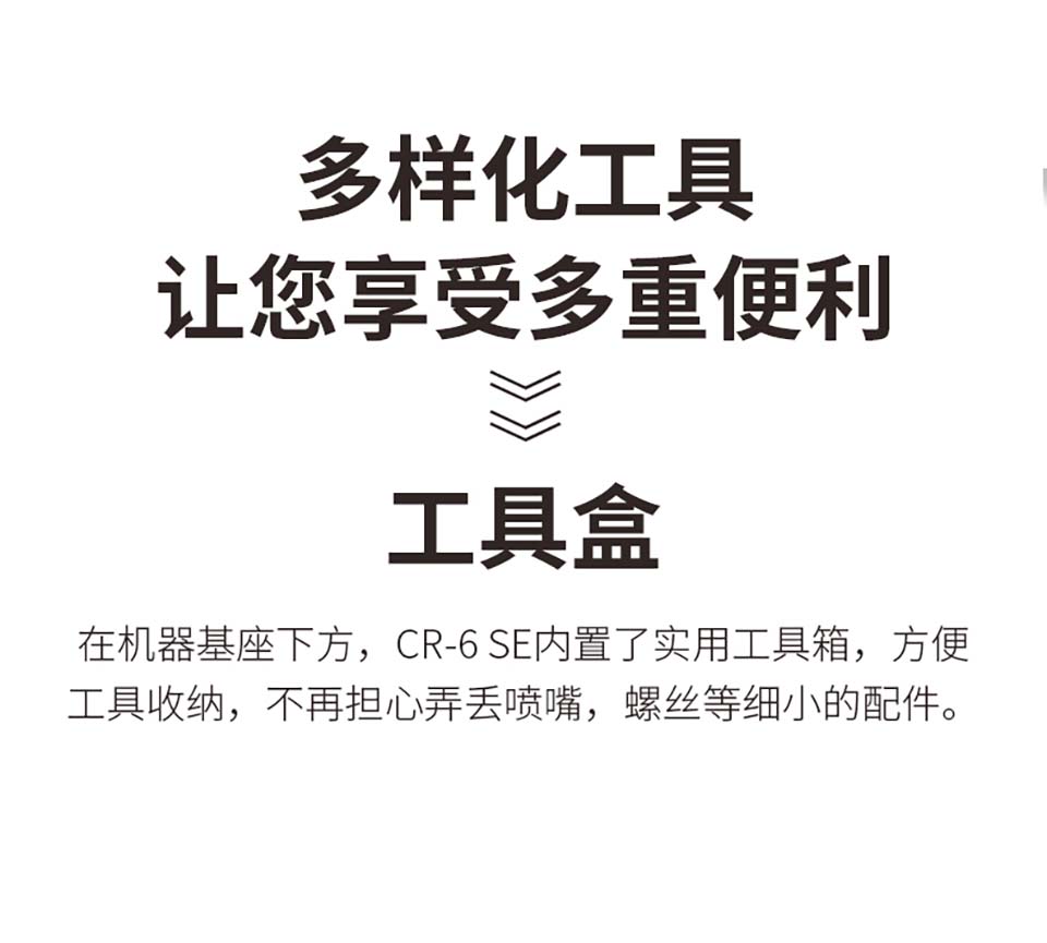 CR-6 SE专为富有创造激情并启发新想法的人们而设计,是迄今为止我们设计和制造的创新性机型。它将能够成为创客们的终极打印机,带来比以往更简单和更无忧的3D打印体验。
