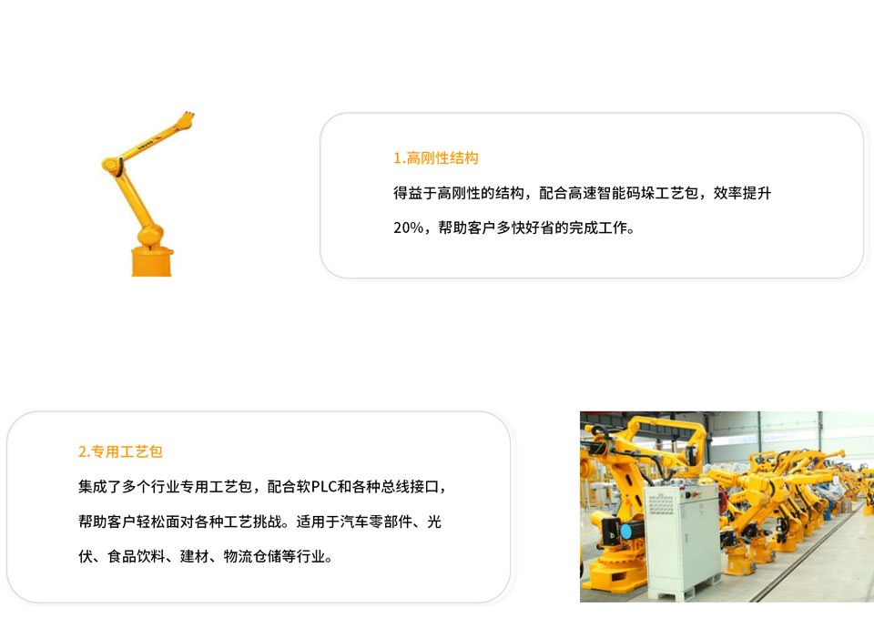 公司分别引进两款灵活型和力量型的埃夫特机器人。力量型埃夫特机器人有高达10公斤的有效载荷,公司可以让它一下子扛起10个箱子,并用包装缆绳绑在一起。灵活型埃夫特机器人的主要任务是切割和处理缆绳,然后由力量型机器人将这一整组放进仓库。 两者协同工作,每小时可以处理多达500个箱子,使工厂能够减轻人力成本和提升生产效率。