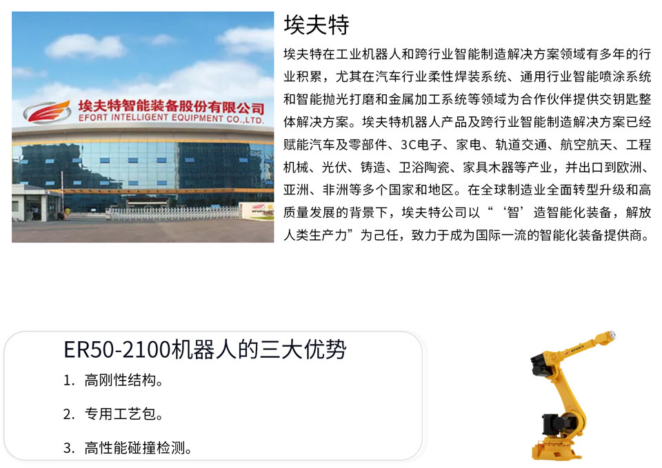 ER50-2100是一款中大负载机器人,手腕部可搬运负载50kg,工作可达半径2146mm。得益于高刚性的结构,配合高速智能码垛工艺包,效率提升20%,帮助客户多快好省的完成工作;集成了多个行业专用工艺包,配合软PLC和各种总线接口,帮助客户轻松面对各种工艺挑战;高性能碰撞检测功能帮助提高安全系数。