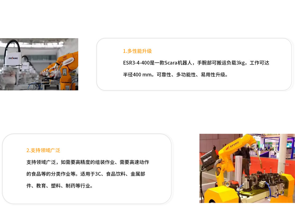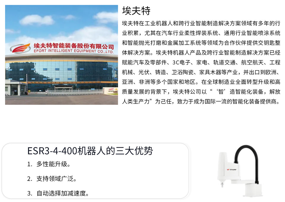 ESR3-4-400是一款Scara机器人,手腕部可搬运负载3kg,工作可达半径400mm。可靠性、多功能性、易用性升级;支持领域广泛,如需要高精度的组装作业、需要高速动作的食品等的分类作业等;可以根据负载和运动姿态,自动选择最佳加速度、减速度,提高生产效率。