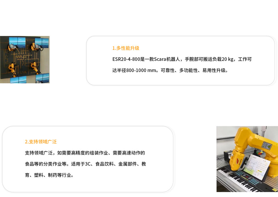 ESR20-4-800是一款Scara机器人,手腕部可搬运负载20kg,工作可达半径800mm。可靠性、多功能性、易用性升级;支持领域广泛,如需要高精度的组装作业、需要高速动作的食品等的分类作业等;可以根据负载和运动姿态,自动选择最佳加速度、减速度,提高生产效率。