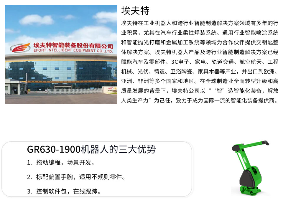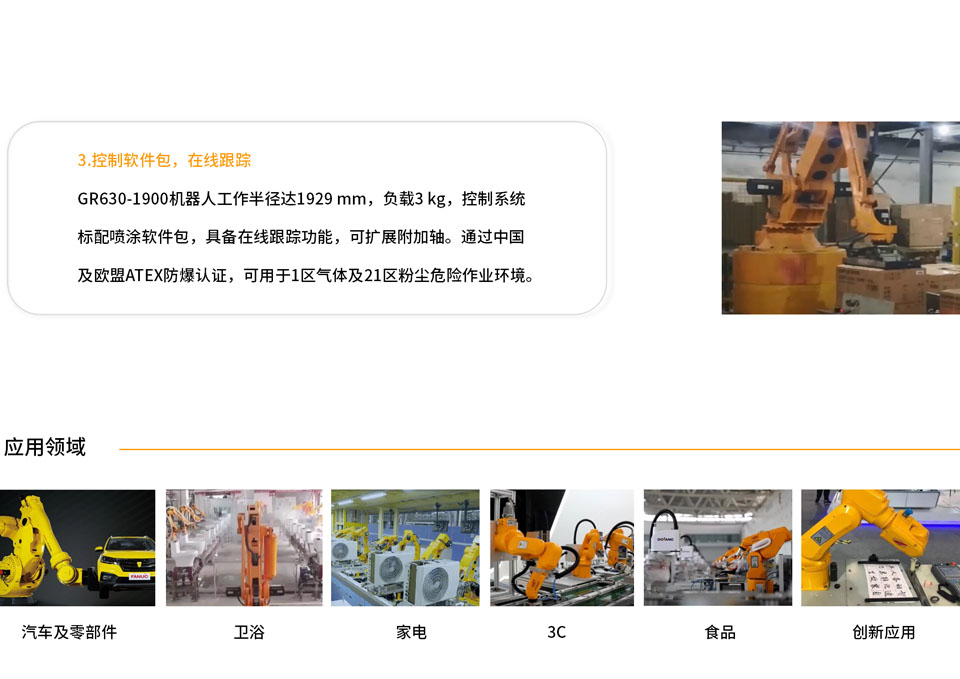 GR630-1900的工作半径是1929mm,偏置手腕,负载3 kg。直接拖动编程,简单易学,操作方便;标配偏置手腕,正面无奇异点,特别适合正面工件喷涂;控制系统标配喷涂软件包,具备在线跟踪功能,可扩展附加轴;尤其适用于五金零件,家具,3C塑料件等不规则形状零件。