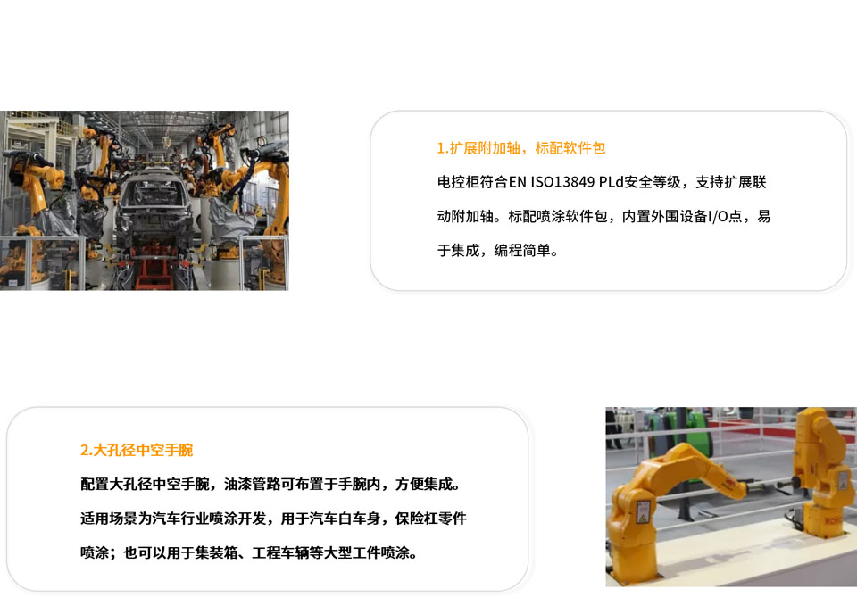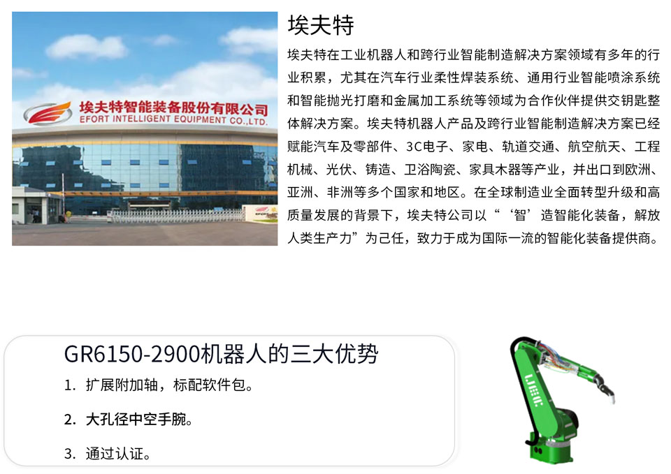 GR6150-2900工作半径2900mm,中空手腕,负载15 kg。配置大孔径中空手腕,油漆管路可布置于手腕内,方便集成;电控柜符合EN ISO13849 PLd安全等级,支持扩展联动附加轴;标配喷涂软件包,内置外围设备I/O点,易于集成,编程简单;通过中国及欧盟ATEX防爆认证,可用于1区气体及21区粉尘危险作业环境。