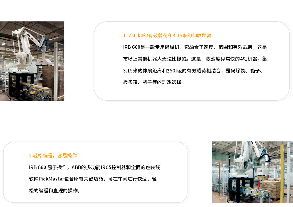 IRB 660优化的电机功率和运动性能确保比竞争产品明显缩短循环时间。新型码垛机有高速版本,能够以全速处理180 kg的有效载荷,以及250 kg版本以实现高吞吐量。