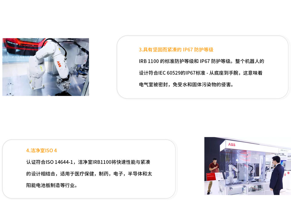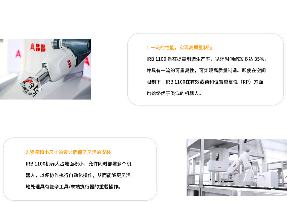 IRB 1100 旨在提高制造生产率,循环时间缩短多达 35%,并具有一流的可重复性,可实现高质量制造。即使在空间限制下,IRB 1100在有效载荷和位置重复性(RP)方面也始终优于类似的机器人。