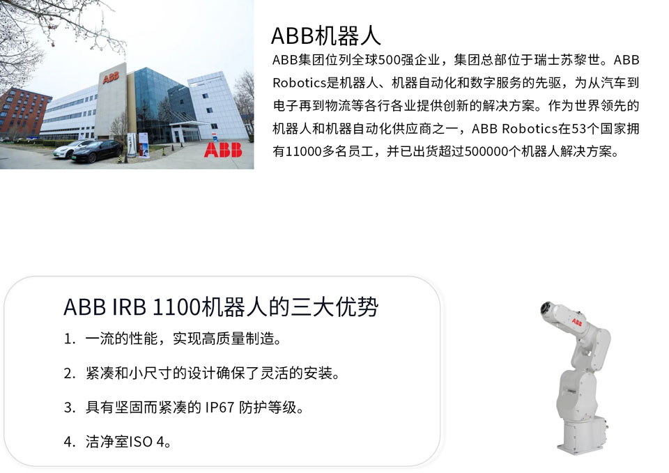 螺丝驱动是汽车装配行业中的重要步骤,必须满足高精度,高可靠性和长寿命等要求。随着自动驾驶技术、智能车联网和电动化趋势的加速发展,汽车制造业对自动化和智能化生产的需求不断增加,因此,自动化的螺丝驱动技术在汽车制造中发挥重要作用。IRB 1100循环时间缩短多达 35%,能提高制造生产率,并具有一流的可重复性,可实现高质量制造。即使在空间限制下,IRB 1100在有效载荷和位置重复性(RP)方面也始终优于类似的机器人,能够帮助企业优化生产过程、提高管理效能。