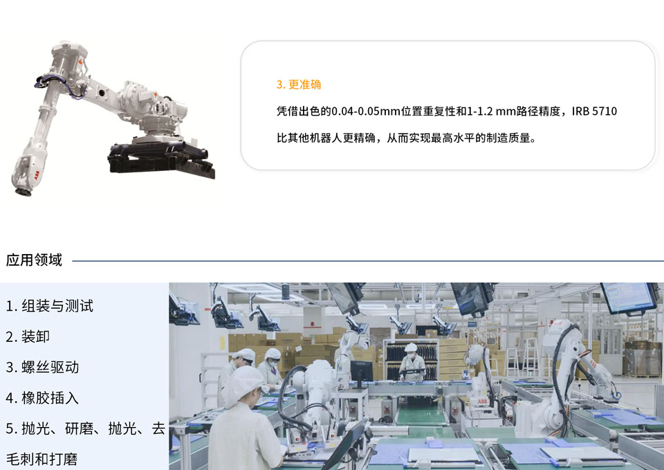 IRB 5710带来更长的正常运行时间、更高的生产率和更好的性能。IRB 5710有四种型号,提供从70kg到110kg的有效载荷选项,范围从2.3m到2.7m。IRB 5710非常适合用于电动汽车电池生产、汽车和一般工业中的物料搬运、机器维护和高精度装配应用。