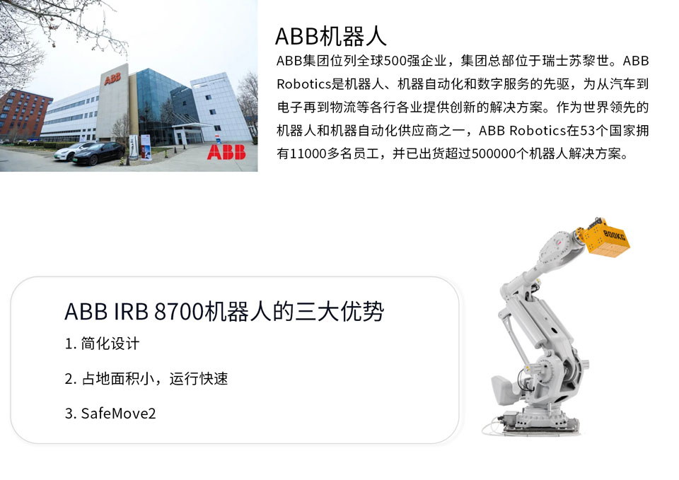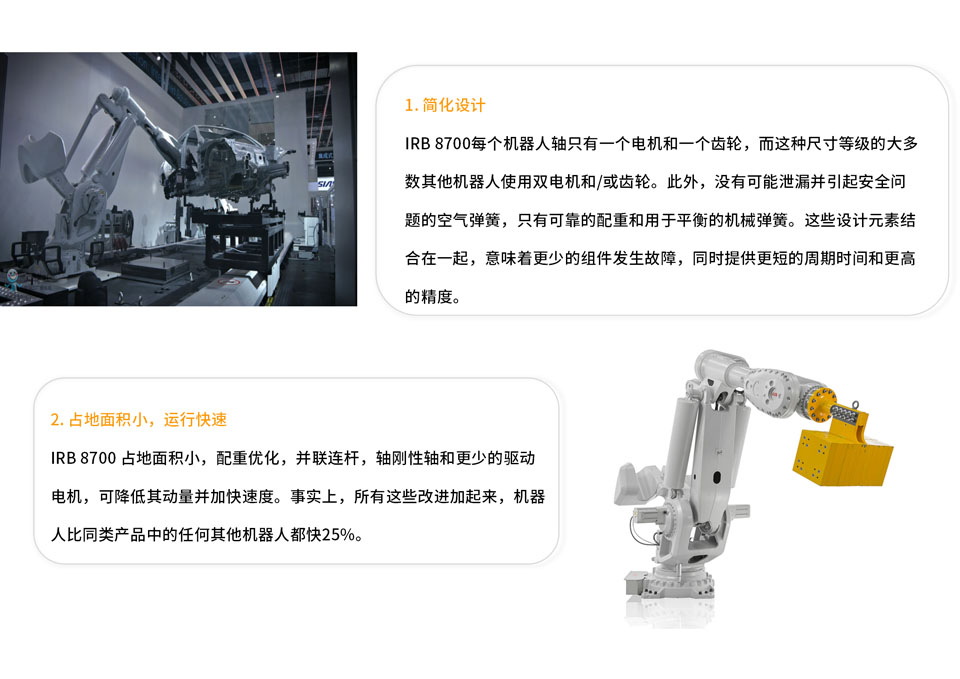IRB 8700是ABB的第8代重型有效载荷高性能工业机器人。IRB 8700 专注于高生产能力、紧凑的设计、简单的维修和低维护成本,是一款通用机器人,其处理能力和可持续性可满足您最苛刻的需求。