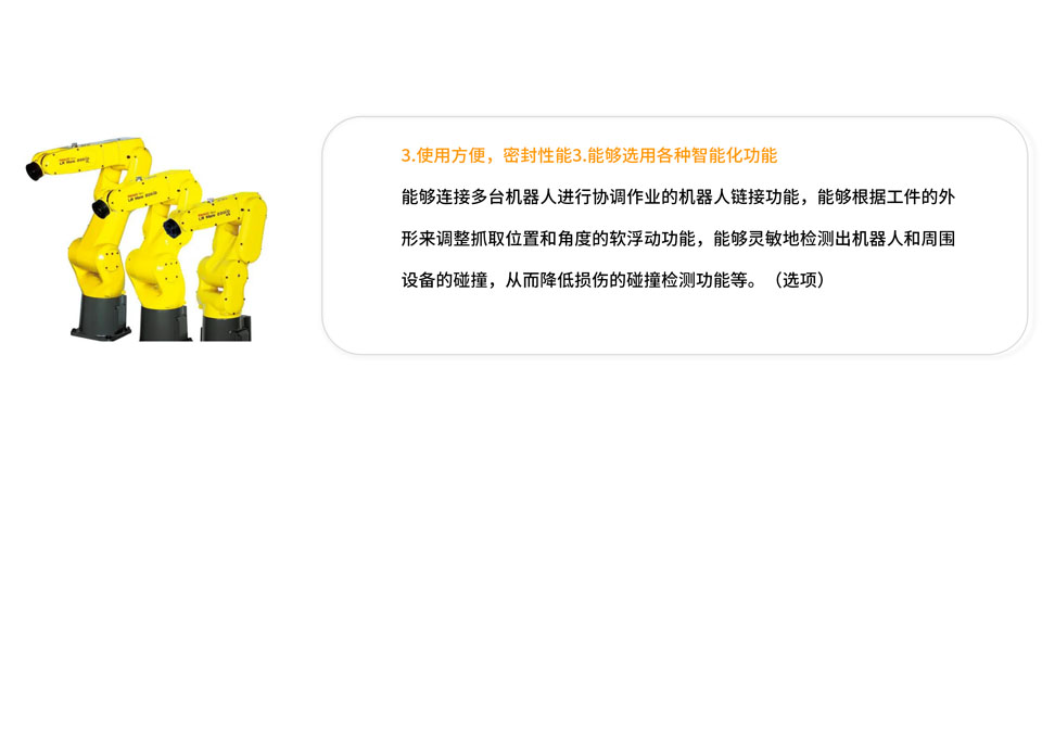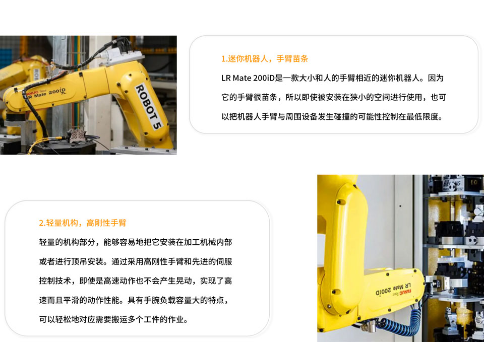 LR Mate 200iD是一款大小和人的手臂相近的迷你机器人,可达半径717mm,手腕可搬运质量为7kg,具有手腕负载容量大的特点,可以轻松地对应需要搬运多个工件的作业。