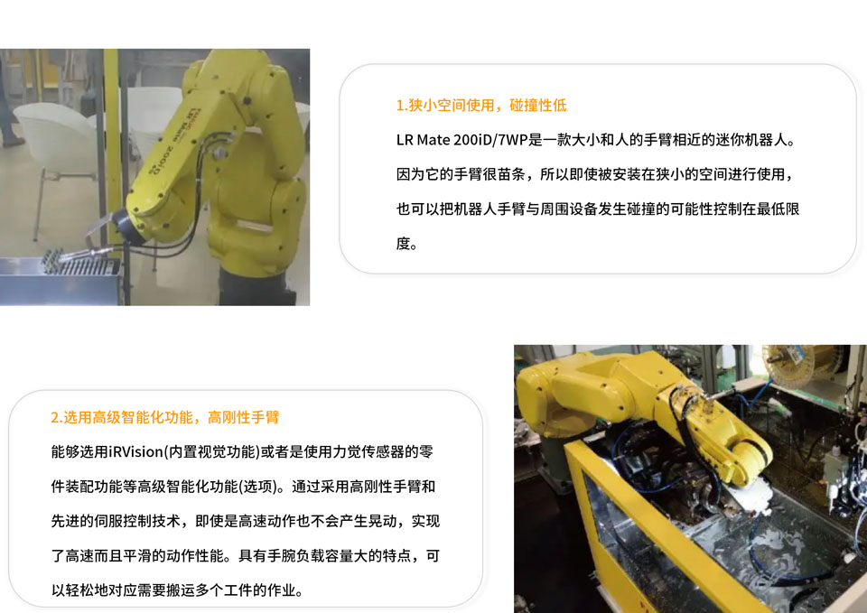 LR Mate 200iD/7WP是一款大小和人的手臂相近的迷你机器人,可达半径717mm,手腕可搬运质量为7kg,手臂很苗条,所以即使被安装在狭小的空间进行使用,也可以把机器人手臂与周围设备发生碰撞的可能性控制在最低限度。