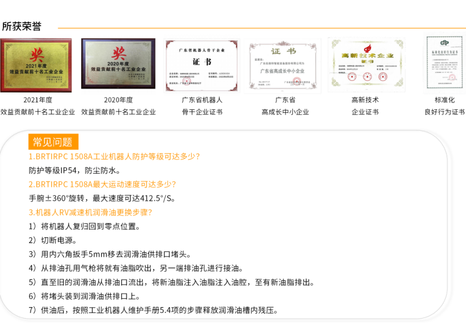 BRTIRPC1508A采用全伺服电机驱动,响应速度快,精度高。其最大负载为8KG,最大臂展可达1500mm。以紧凑的结构实现大范围动作,运动灵活,精准。 用途:在工业生产中能代替人做某些单调、频繁和重复的长时间作业,或是危险、恶劣环境下的作业,例如在冲压机、压力铸造、热处理、焊接、涂装、塑料制品成形、机械加工和简单装配等工序上,以及在原子能工业等部门中,完成对人体有害物料的搬运或工艺操作等,完美完成上下料工艺。 防护等级高⸺IP50,防尘。