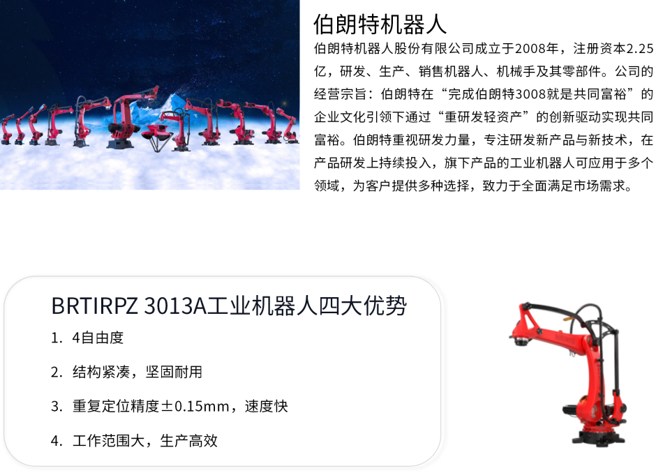 BRTIRPZ3013A是伯朗特机器人股份有限公司针对某些单调、频繁和重复的长时间作业,或是危险、恶劣环境下的作业等而开发的一款四轴码垛机器人,其拥有3020mm臂展,最大负载可达130kg。具有多自由度的灵活性,对上下料、搬运、拆垛、码垛等场景能够应对自如。 防护等级高-IP50, 防尘精度高一重复定位精度±0.15mm。