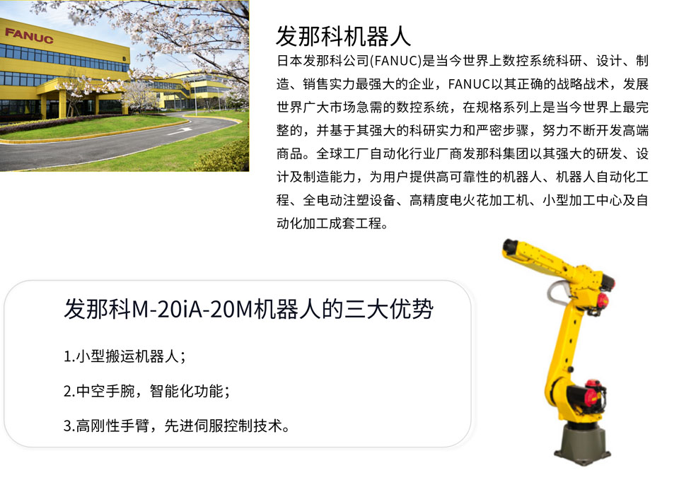 M-20iA/20M是搬运质量为20kg的小型搬运机器人,半径可达1813mm。通过采用具有高刚性的手臂和先进的伺服控制技术,提高了加减速性能。广泛应用于焊接、装配、喷涂及涂装、机床上下料、材料加工、码垛、物流搬运、拾取及包装等行业。