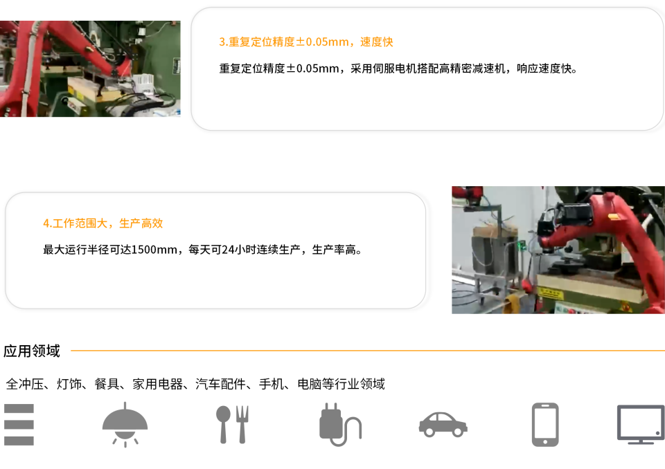BRTIRUS1510A是伯朗特机器人股份有限公司针对多自由度的复杂应用而开发的六轴机器人,其最大负载可达10kg,拥有1500mm臂展。采用轻量式手臂设计,机械结构紧凑、简洁,在高速运动状态下,能够在狭小工作空间内进行灵活作业,满足柔性化生产需要。具有六个自由度的灵活性,对上下料、注塑、压铸、装配、涂胶、打磨、检测等场景能够随心所欲。 防护等级高一IP50, 防尘精度高一重复定位精度±0.05mm, 操作简单一采用华成控制系统适用于注塑机:200T-60