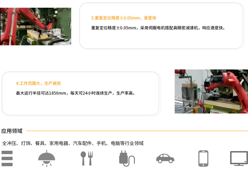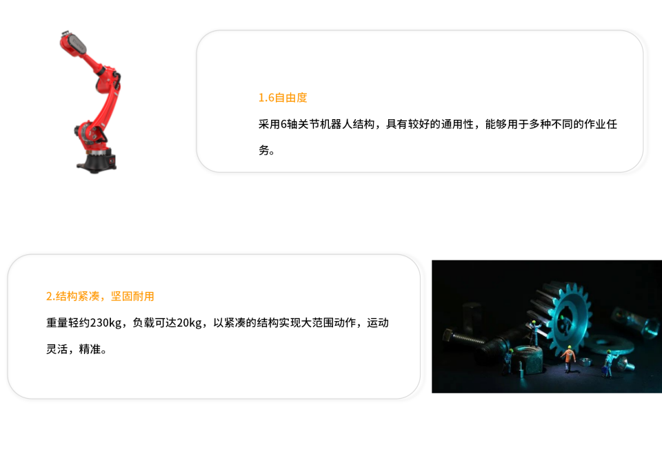 BRTIRUS1820A是伯朗特机器人股份有限公司针对多自由度的复杂应用而开发的六轴机器人,其最大负载可达20kg,拥有1850mm臂展。采用轻量式手臂设计,机械结构紧凑、简洁,在高速运动状态下,能够在狭小工作空间内进行灵活作业,满足柔性化生产需要。具有六个自由度的灵活性,对上下料、注塑、压铸、装配、涂胶、打磨、检测等场景能够随心所欲。 防护等级高—手腕 IP54、本体 IP50, 防尘防水精度高一重复定位精度±0.05mm 适用于注塑机:500T-130