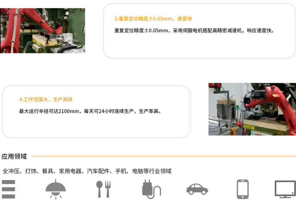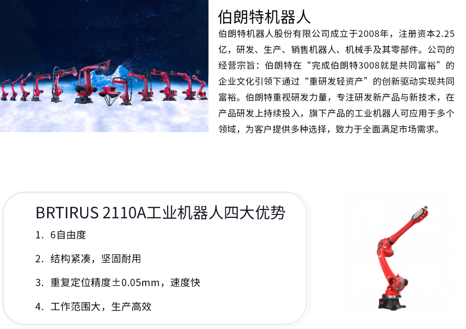 BRTIRUS2110A是伯朗特机器人股份有限公司针对焊接应用行业开发的一款六轴工业机器人,其拥有2100mm长臂展,最大负载可达10kg。具有六个自由度的灵活性,对焊接、上下料、装配等场景能够应对自如。 防护等级高-手腕IP54、本体 IP50, 防尘防水精度高一重复定位精度±0.05mm。