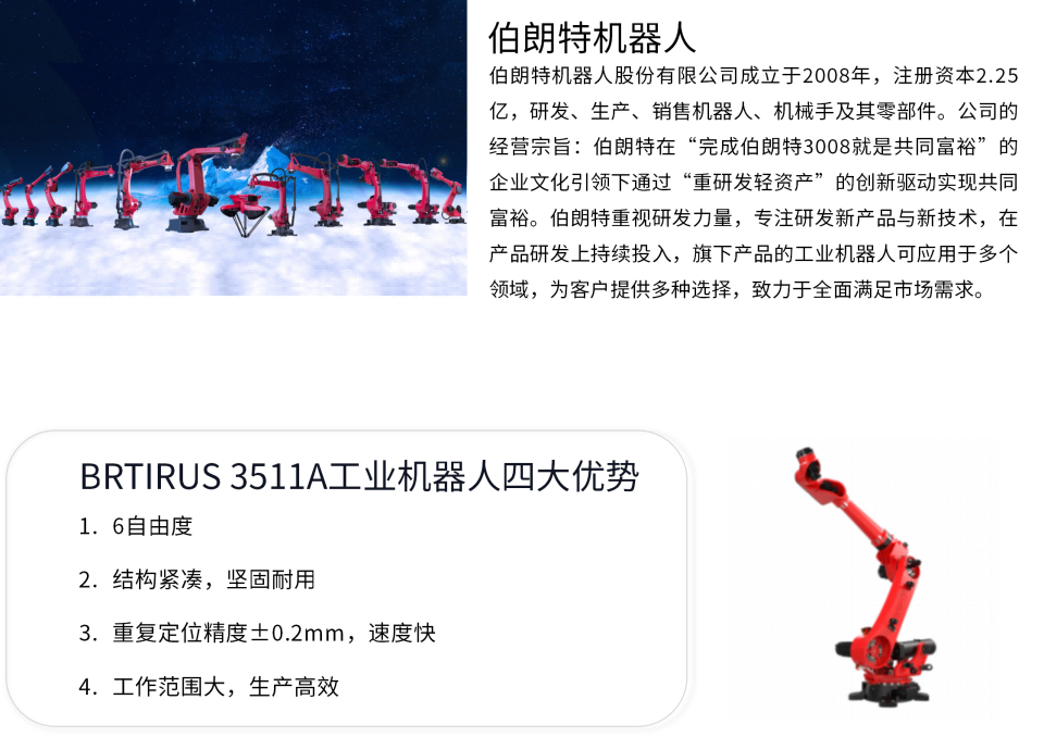 BRTIRUS3511A是伯朗特机器人股份有限公司针对某些单调、频繁和重复的长时间作业,或是危险、恶劣环境下的作业等而开发的一款六轴通用工业机器人,其拥有3500mm臂展,最大负载可达100kg。具有多自由度的灵活性,对上下料、搬运、码垛等场景能够应对自如。 防护等级高-IP50, 防尘精度高一重复定位精度±0.2mm。