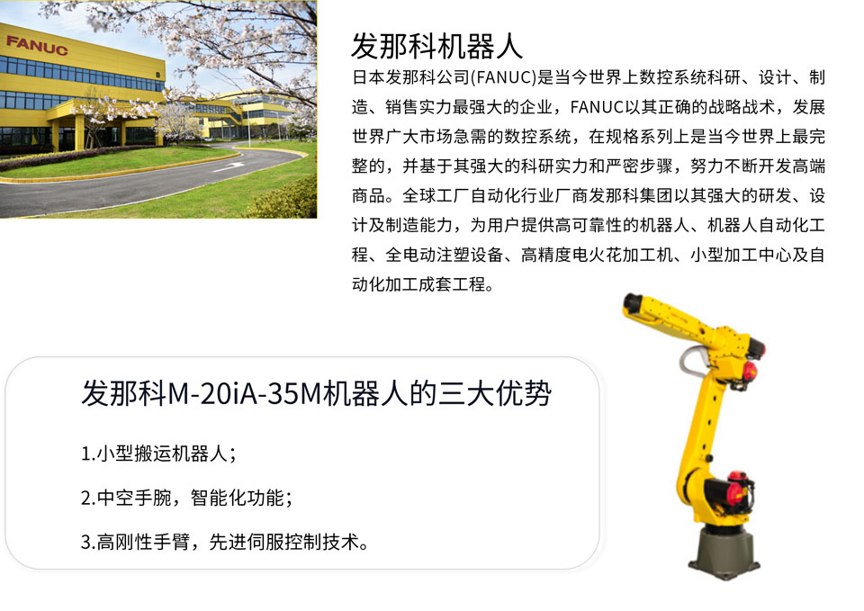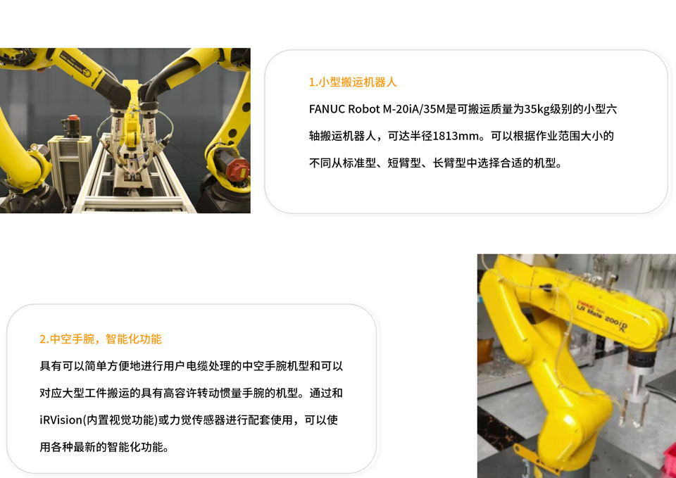 M-20iA/35M是搬运质量为20kg的小型搬运机器人,半径可达1813mm。通过采用具有高刚性的手臂和先进的伺服控制技术,提高了加减速性能。广泛应用于焊接、装配、喷涂及涂装、机床上下料、材料加工、码垛、物流搬运、拾取及包装等行业。