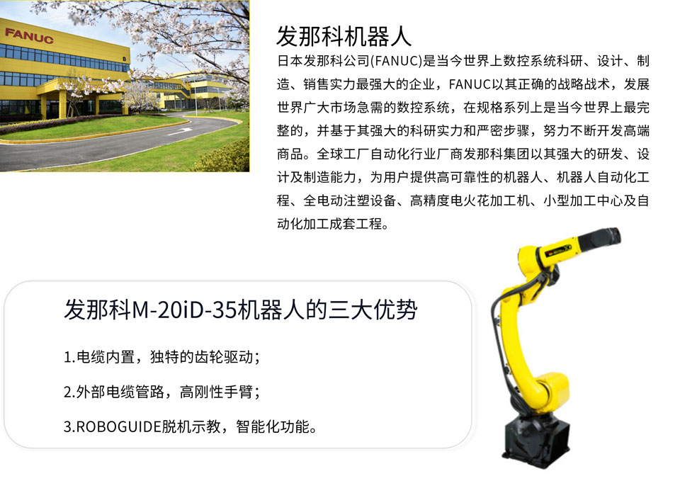 M-20iD/35是电缆内置式的小型智能机器人,工作半径可达1831mm,可搬运质量为35kg, 独特的齿轮驱动机构,实现高转动惯量的运动特性,机器人手臂电缆内置。高刚性手臂实现了高速、高精度的机器人运动性能,进而提升机器人系统的生产效率。