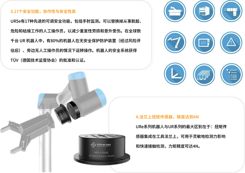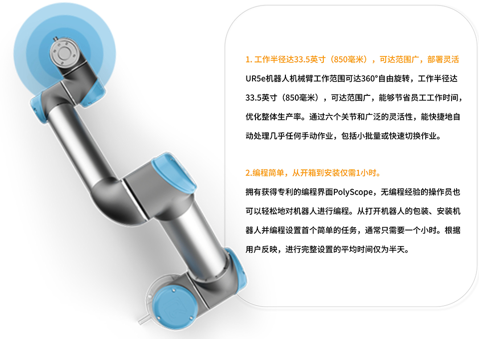 优傲UR5e协作机器人具备5kg有效载荷,工作半径达850mm,兼具灵活性和安全性。UR5e柔性机器人适合低重量的自动化处理任务,可应用于拾取、放置、测试等重复性较强的工作。UR5e易于编程,快速设置,可以无限附加末端工作,易用性和泛用性强,能为绝大多数企业提供提供生产支持。