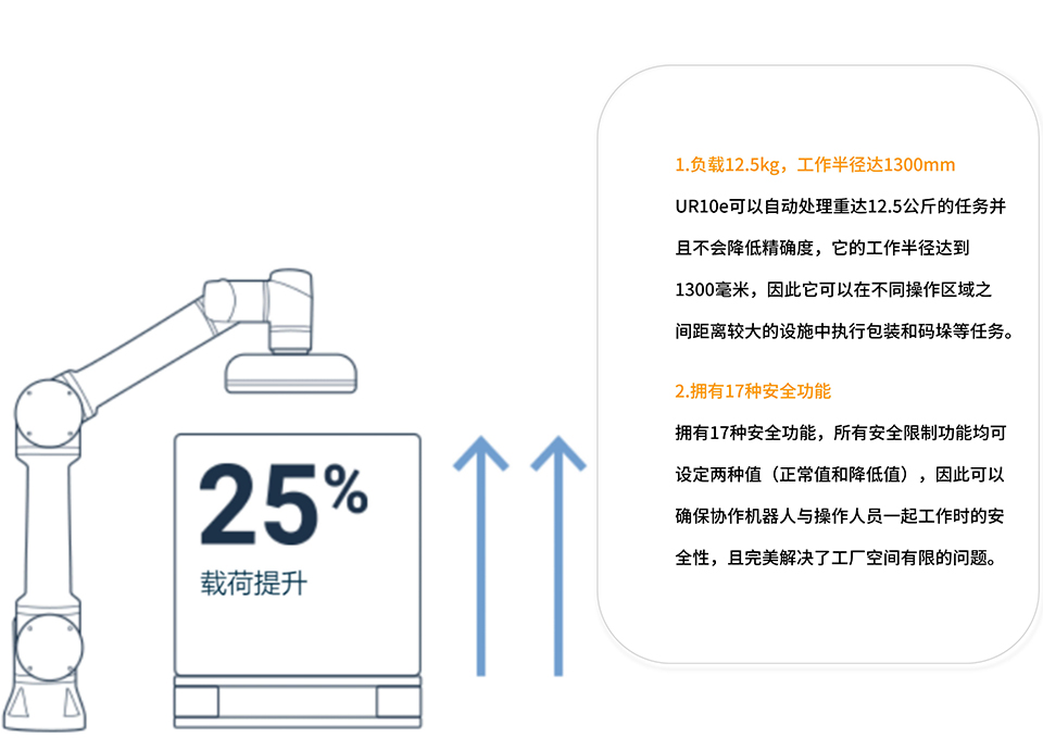优傲UR10e协作机器人具备1300mm的工作半径,有效载荷提升25%至12.5kg。UR10e部署灵活方便、应用场景丰富,适用于机器看护、拆码垛、包装等行业。UR10e性能升级,能一次操作更多产品,搭载更重的末端工具,能在保证精度的同时处理重达10公斤的任务,有效提高企业生产效率。