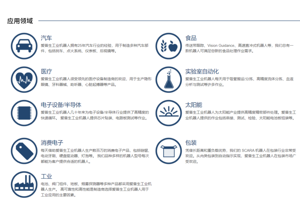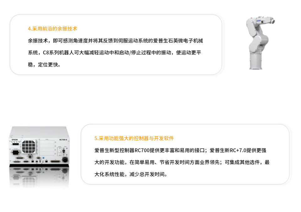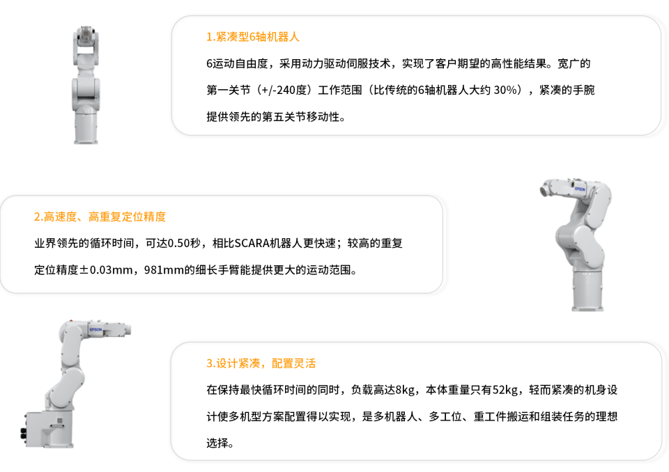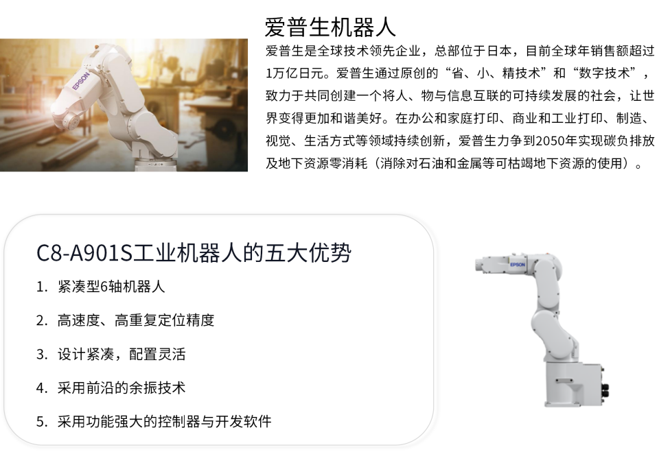 C8-A901S机器人负载高达8kg,是C4系列的双倍负载,通过更快的速度和精度提高生产效率,多机器人、多工位、重工件搬运和组装任务的理想选择。先进的爱普生技术保证高负载作业下高速度和低震动。