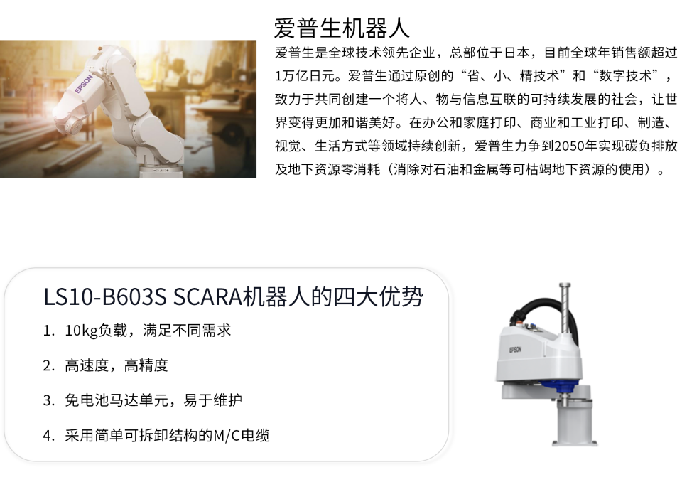 LS10-B603S机器人最大负载10kg,适用于多夹具、多工件场合,具有更短的循环时间,满足高速作业需求;免电池的马达单元,易于维护;可拆卸的本体—控制器线缆,方便搬运及组装。