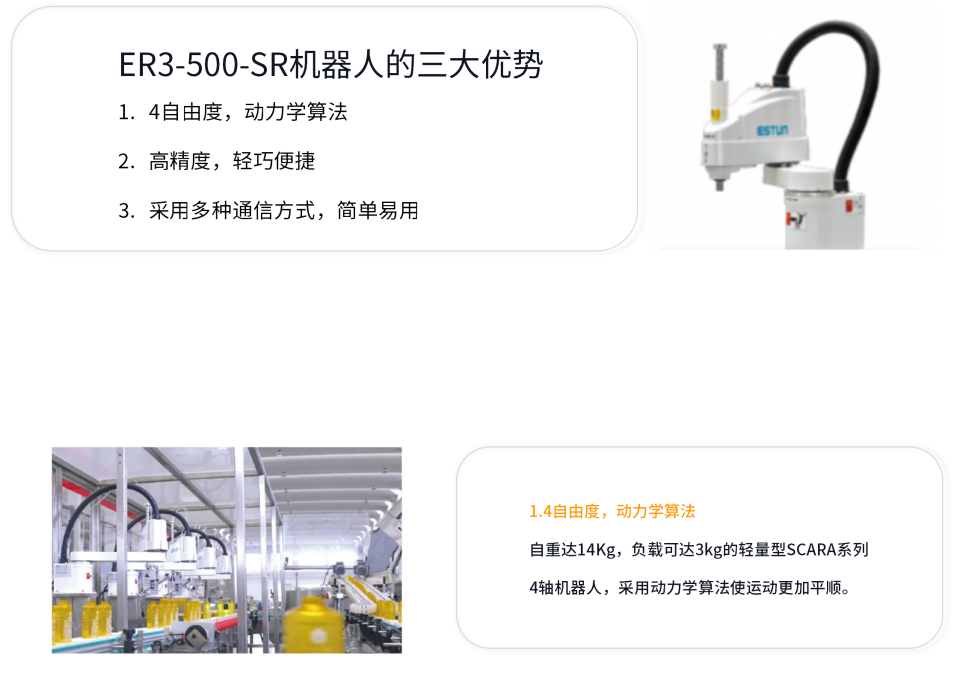 埃斯顿SCARA机器人主打高效、高精、易用, 已在3C、锂电、包装、光伏等行业得到广泛应用。全系列产品采用埃斯顿专用伺服系统、搭配埃斯顿全新一代的动力学算法使其运动更加平顺、速度更快、精度更高。其支持虚拟与实体示教器、ESTUN Editor编程软件等多样化的编程方式,使用更加灵活多变。