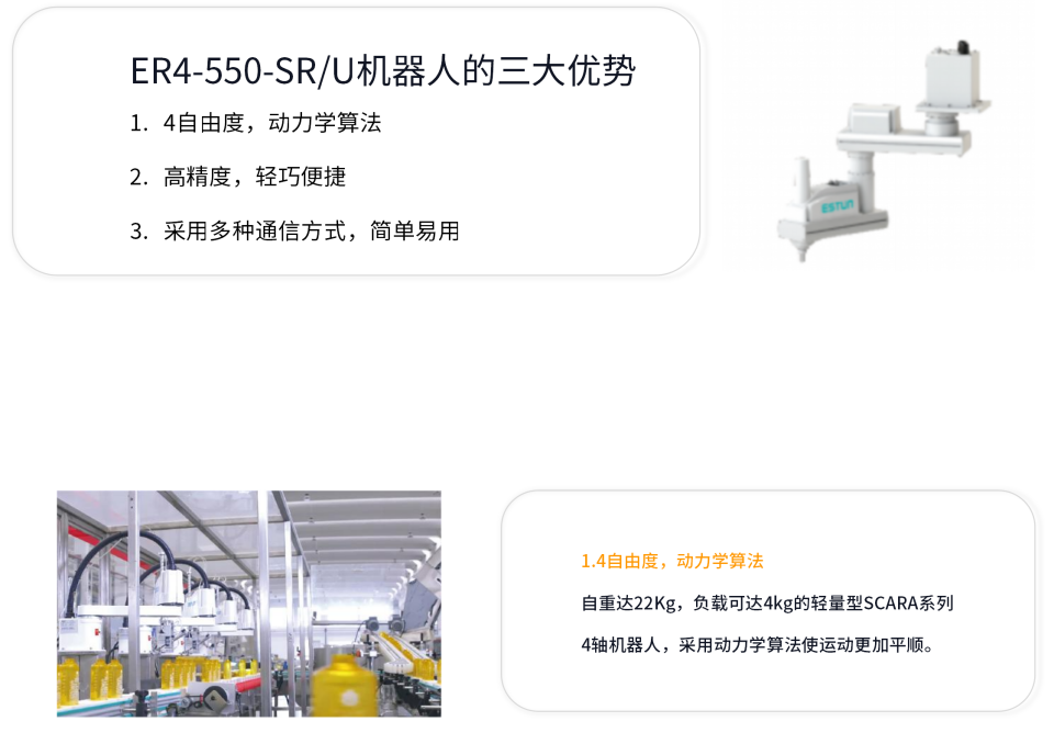 埃斯顿SCARA机器人主打高效、高精、易用, 已在3C、锂电、包装、光伏等行业得到广泛应用。全系列产品采用埃斯顿专用伺服系统、搭配埃斯顿全新一代的动力学算法使其运动更加平顺、速度更快、精度更高。其支持虚拟与实体示教器、ESTUN Editor编程软件等多样化的编程方式,使用更加灵活多变。