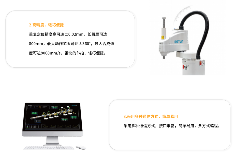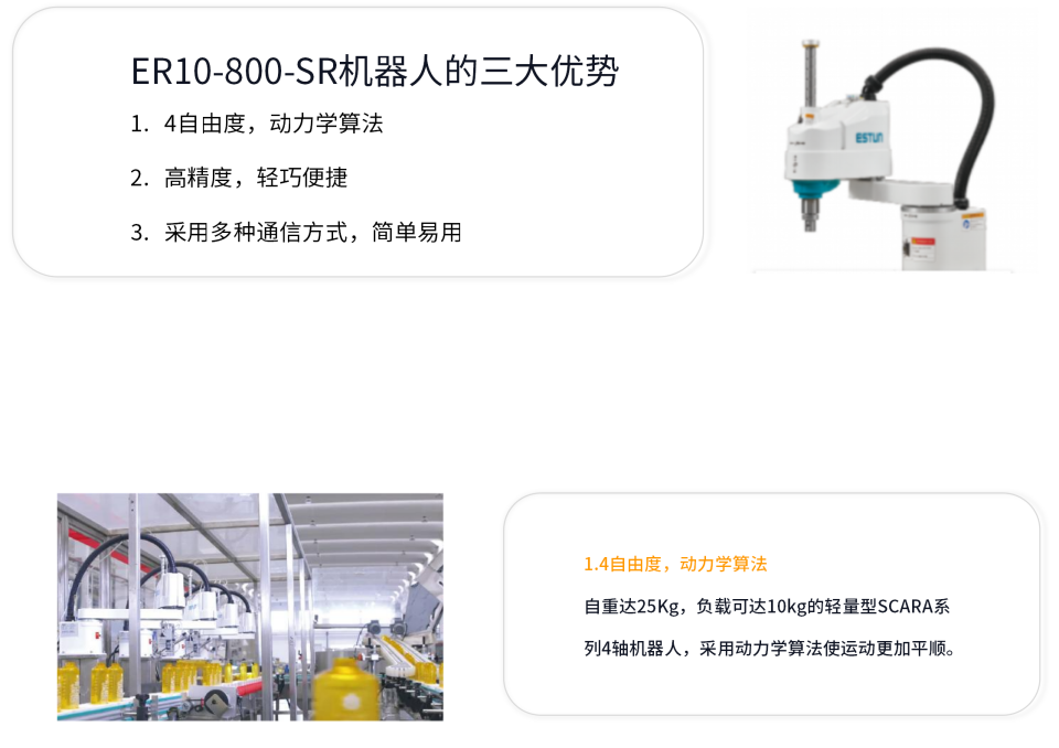 埃斯顿SCARA机器人主打高效、高精、易用, 已在3C、锂电、包装、光伏等行业得到广泛应用。全系列产品采用埃斯顿专用伺服系统、搭配埃斯顿全新一代的动力学算法使其运动更加平顺、速度更快、精度更高。其支持虚拟与实体示教器、ESTUN Editor编程软件等多样化的编程方式,使用更加灵活多变。
